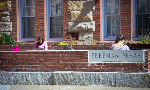 Freeman Plaza was constructed in 1977 with a gift from Howard Freeman ’40 and his wife, Esther. Freeman earned a degree in mechanical engineering at WPI and became a well-known inventor and entrepreneur. During World War II, he invented the waterfog nozzle, a device that extinguished oil fires with sea water, saving many ships and thousands of lives. He also invented a fire-fighting fogfoam nozzle used on airport crash trucks and founded the Jamesbury Corporation in Worcester.