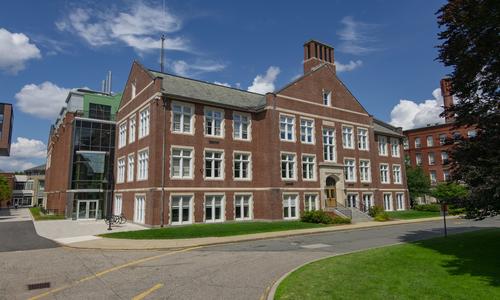 Higgins Labs was built in 1942 to provide a new home for the Department of Mechanical Engineering, which had outgrown its space in Stratton Hall. The three-story building was named after Milton P. Higgins, the first superintendent of WPI’s Washburn Shops; it originally housed early laboratories for experiments in heat transfer, lubricants, fuels, structure of metals, ventilation, heating, refrigeration, metallurgy, and internal combustion. In 1994 the building was completely refurbished and expanded—it now houses classrooms and labs for the departments of Mechanical Engineering and Aerospace Engineering, as well as several robotics engineering labs. Facilities include a state-of-the-art design studio, low-speed wind tunnel, and laboratories for computer-aided engineering, fluid dynamics and thermal processes, laser holography, structural dynamics and vibrations, manufacturing, and rehabilitation engineering and biomechanics.