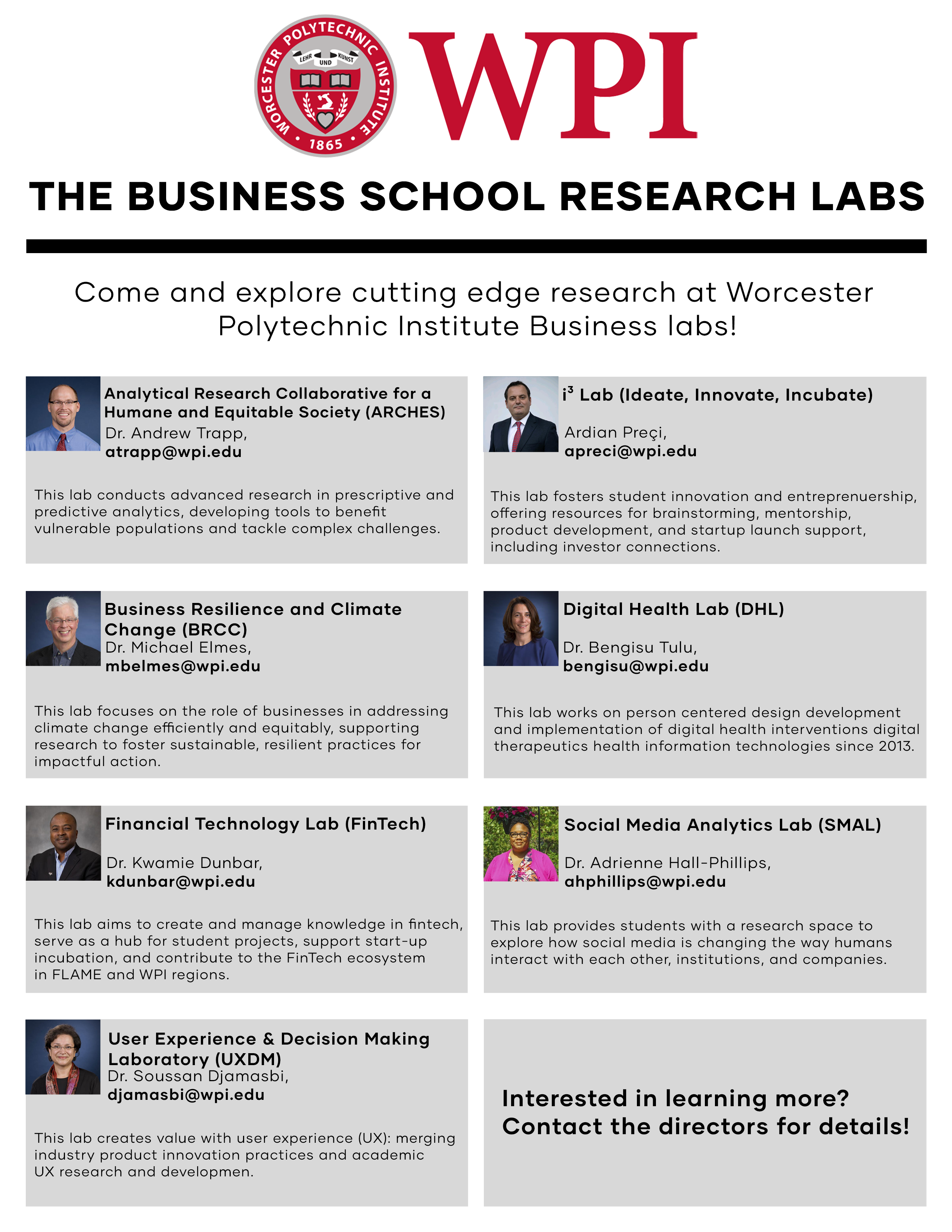 At the forefront of innovation and entrepreneurship, WPI's Business School faculty brings research into the classroom, giving students an opportunity to learn by doing. From applications that help people manage diabetes and reduce stress, to eye- tracking technology that improves user experiences, to how businesses can learn from the arts, to projects that help make businesses more sustainable, our faculty research makes a real-world impact while inspiring a new generation of makers, leaders, and boundary breakers.