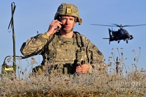 A company commander directs an AH-64 Apache helicopter onto its target during a training exercise.