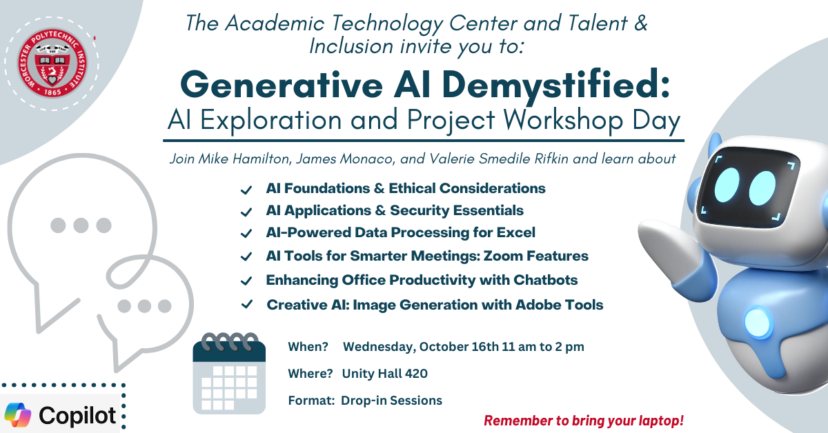 Next Wednesday (October 16th), join Mike Hamilton, James Monaco, Valerie Smedile Rifkin, and Albert Enyedy from the Academic Technology Center, in partnership with Talent & Inclusion, to explore various AI tools and features! Whether you want to work on your projects with the team or participate in short, focused demos, this session is structured to be engaging and adaptable to your schedule.