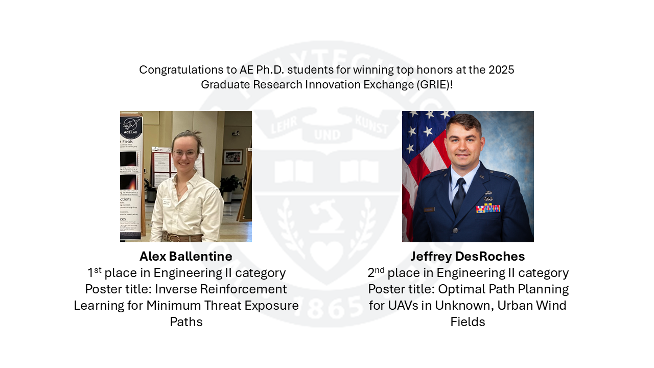 Aerospace EngineeringCongratulations to AE Ph.D. students for winning top honors at the 2025 Graduate Research Innovation Exchange (GRIE)!