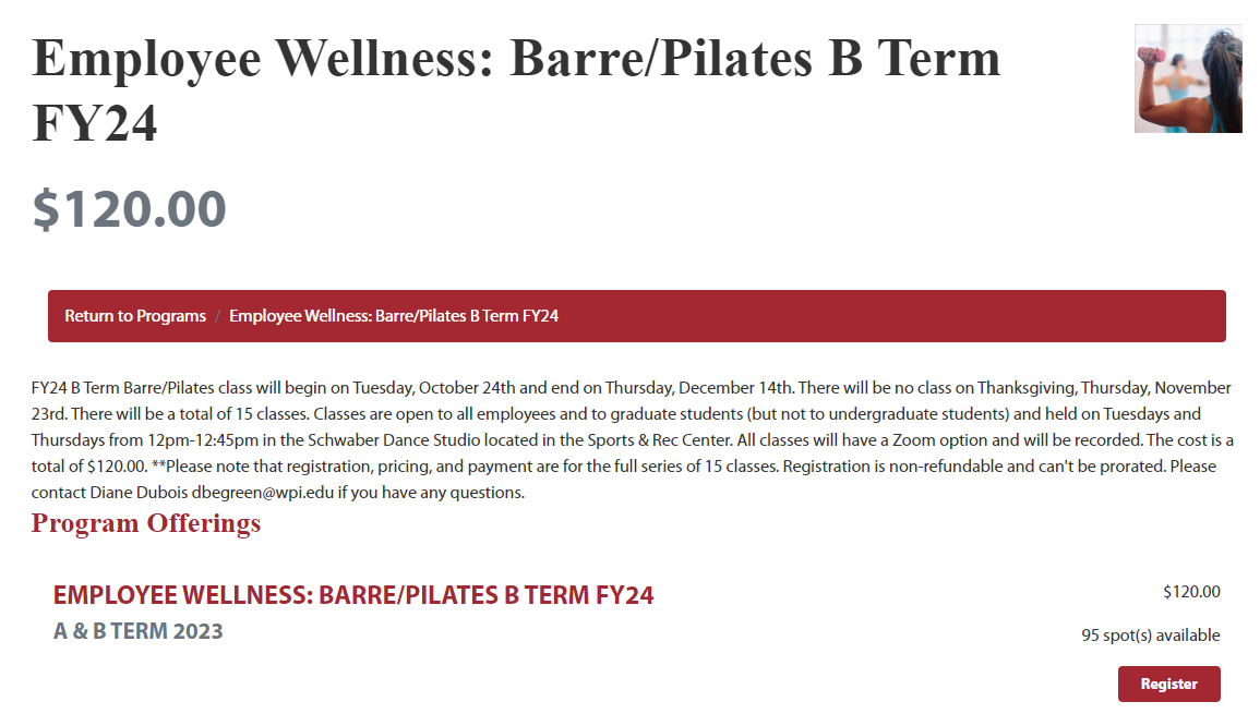 Division of Talent & InclusionFY24 B Term Barre/Pilates class will begin on Tuesday, October 24th and end on Thursday, December 14th. There will be no class on Thanksgiving, Thursday, November 23rd. There will be a total of 15 classes. Classes are open to all employees and to graduate students (but not to undergraduate students) and held on Tuesdays and Thursdays from 12pm-12:45pm in the Schwaber Dance Studio located in the Sports & Rec Center. All classes will have a Zoom option and will be recorded. The cost is a total of $120.00. **Please note that registration, pricing, and payment are for the full series of 15 classes. Registration is non-refundable and can't be prorated.