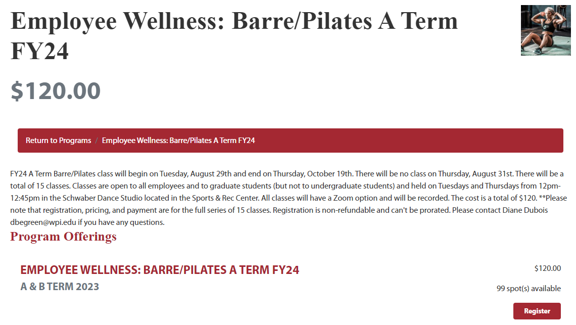 Division of Talent & InclusionFY24 A Term Barre/Pilates class will begin on Tuesday, August 29th and end on Thursday, October 19th. There will be no class on Thursday, August 31st. There will be a total of 15 classes. Classes are open to all employees and to graduate students (but not to undergraduate students) and held on Tuesdays and Thursdays from 12pm-12:45pm in the Schwaber Dance Studio located in the Sports & Rec Center. All classes will have a Zoom option and will be recorded. The cost is a total of $120. **Please note that registration, pricing, and payment are for the full series of 15 classes. Registration is non-refundable and can't be prorated.
