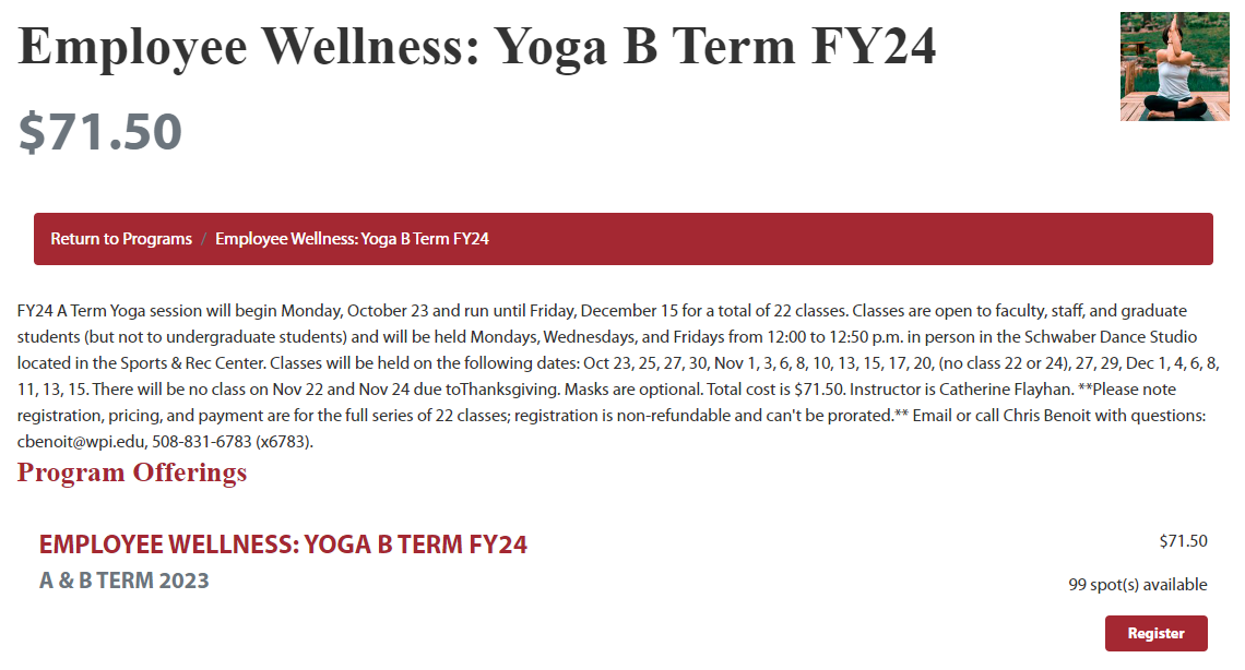 Division of Talent & InclusionFY24 B Term Yoga session will begin Monday, October 23 and run until Friday, December 15 for a total of 22 classes. Classes are open to faculty, staff, and graduate students (but not to undergraduate students) and will be held Mondays, Wednesdays, and Fridays from 12:00 to 12:50 p.m. in person in the Schwaber Dance Studio located in the Sports & Rec Center. Classes will be held on the following dates: Oct 23, 25, 27, 30, Nov 1, 3, 6, 8, 10, 13, 15, 17, 20, 27, 29, Dec 1, 4, 6, 8, 11, 13, 15. There will be no class on Nov 22 and Nov 24 due toThanksgiving. Masks are optional. Total cost is $71.50. Instructor is Catherine Flayhan. **Please note registration, pricing, and payment are for the full series of 22 classes; registration is non-refundable and can't be prorated.**
