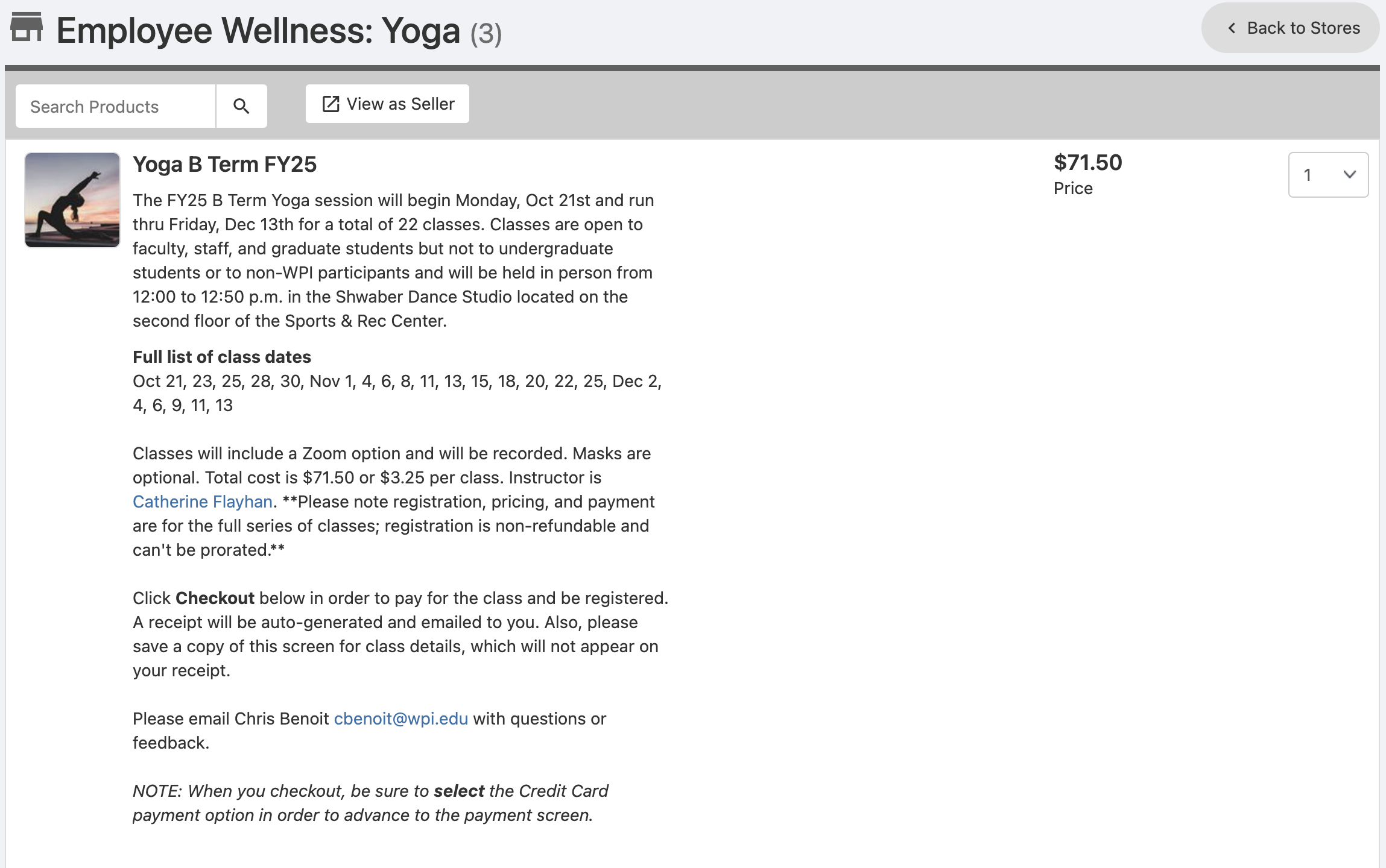 The FY25 A Term Yoga session will begin Monday, Oct 21 and run thru Friday, Dec 13 for a total of 22 classes. Classes are open to faculty, staff, and graduate students but not to undergraduate students or to non-WPI participants and will be held in person from 12:00 to 12:50 p.m. in the Shwaber Dance Studio located on the second floor of the Sports & Rec Center.