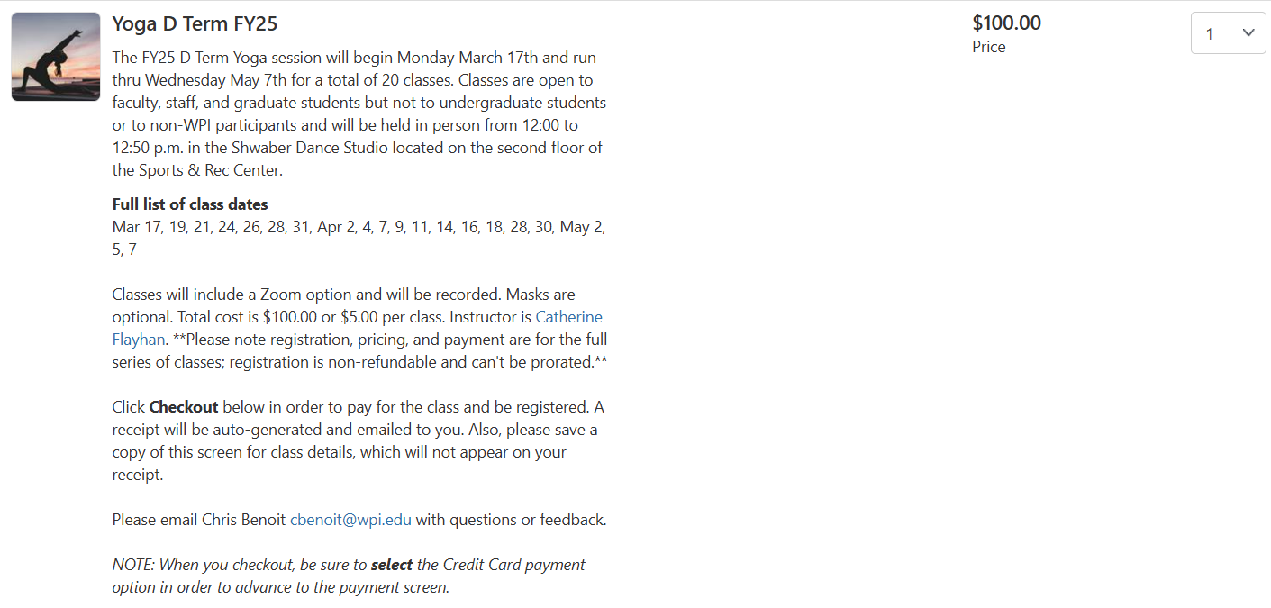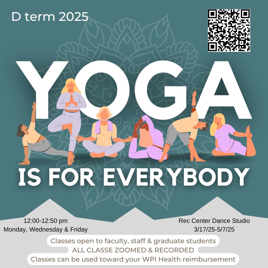 The FY25 D Term Yoga session will begin Monday March 17th and run thru Wednesday May 7th for a total of 20 classes. Classes are open to faculty, staff, and graduate students but not to undergraduate students or to non-WPI participants and will be held in person from 12:00 to 12:50 p.m. in the Shwaber Dance Studio located on the second floor of the Sports & Rec Center.