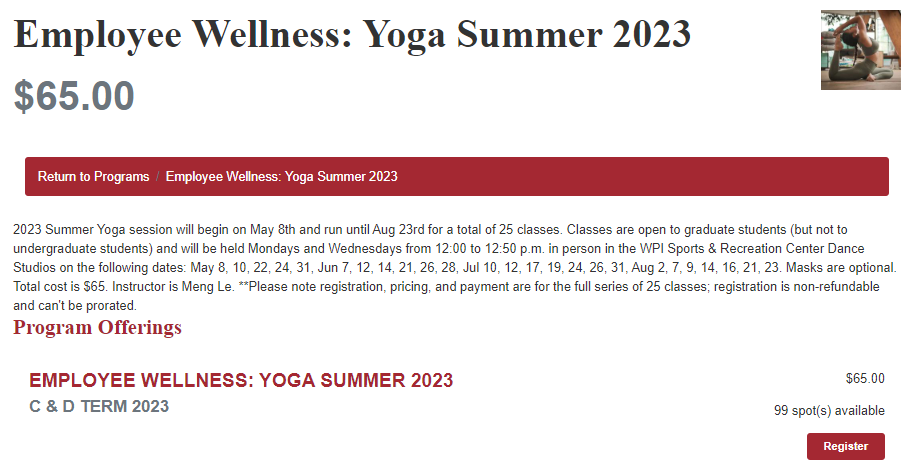 Division of Talent & Inclusion2023 Summer Yoga session will begin on May 8th and run until Aug 23rd for a total of 25 classes. Classes are open to graduate students (but not to undergraduate students) and will be held Mondays and Wednesdays from 12:00 to 12:50 p.m. in person in the WPI Sports & Recreation Center Dance Studios on the following dates: May 8, 10, 22, 24, 31, Jun 7, 12, 14, 21, 26, 28, Jul 10, 12, 17, 19, 24, 26, 31, Aug 2, 7, 9, 14, 16, 21, 23. Masks are optional. Total cost is $65. Instructor is Meng Le. **Please note registration, pricing, and payment are for the full series of 25 classes; registration is non-refundable and can't be prorated.