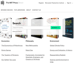 MIT Press ebooks are now available from Gordon Library. MIT Press has recently launched their own platform with their complete ebook collection of 2,500 titles related to art and architecture, biomedical sciences, business and finance, computer science, cognitive science, design, education, environment, game studies, humanities, information science, linguistics, neuroscience, new media, philosophy, and social sciences.