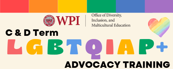 Join the Office of Diversity, Inclusion, and Multicultural Education for LGBTQIAP+ Advocacy Trainings! These trainings are divided into a 101- and 201-level and will be offered on a termly basis in Higgins Labs 114 (C-Term) and Stratton Hall 301 (D-Term). Both trainings will include creating an action plan and discovering new resources for continued learning. Trainings are limited to 30 people maximum. Registration on myWPI is recommended. Please contact Lauren Feldman (they/she) at diversity@wpi.edu with any questions or accommodations requests.