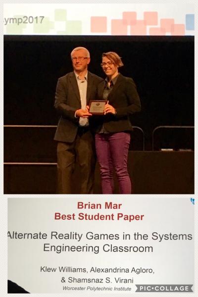 Humanities & ArtsRecent IMGD MS graduate Klew Williams, Alexandrina Agloro (HUA), and Shams Virani (Systems Engineering) have been recognized for their outstanding research paper. "Alternate Reality Games in the Systems Engineering Classroom" was selected as a recipient of a 27th Annual International Symposium Brian Mar Best Student Paper Award by INCOSE Technical Operations. INCOSE, The International Council on Systems Engineering, announced the award at its International Symposium in Adelaide, July 17-20, 2017. The paper came out of a Teagle-funded project to integrate the liberal arts in engineering education.