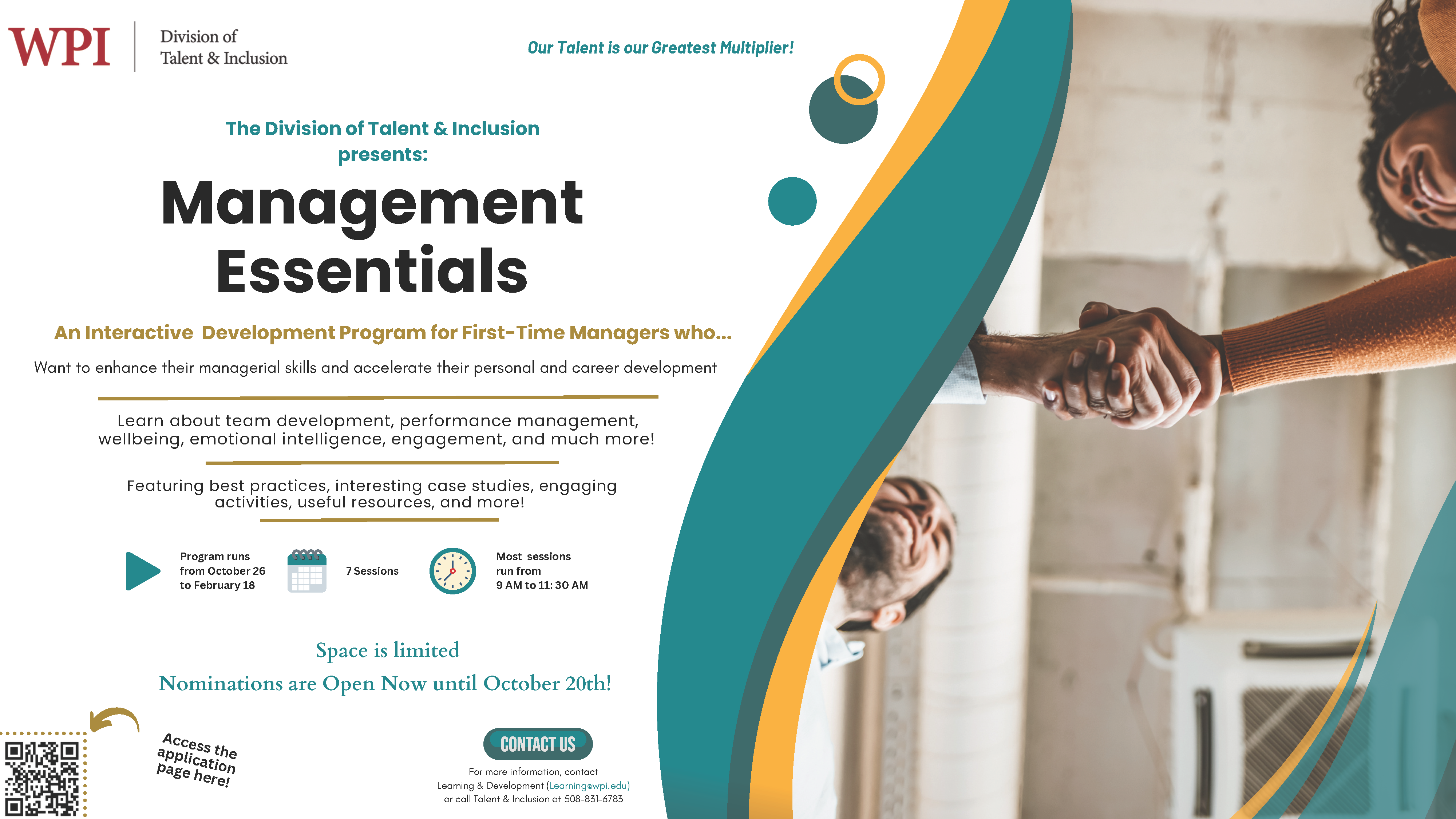 For questions or more information about the program, contact Talent & Inclusion (508-831-5007) or email Learning & Development (Learning@wpi.edu).