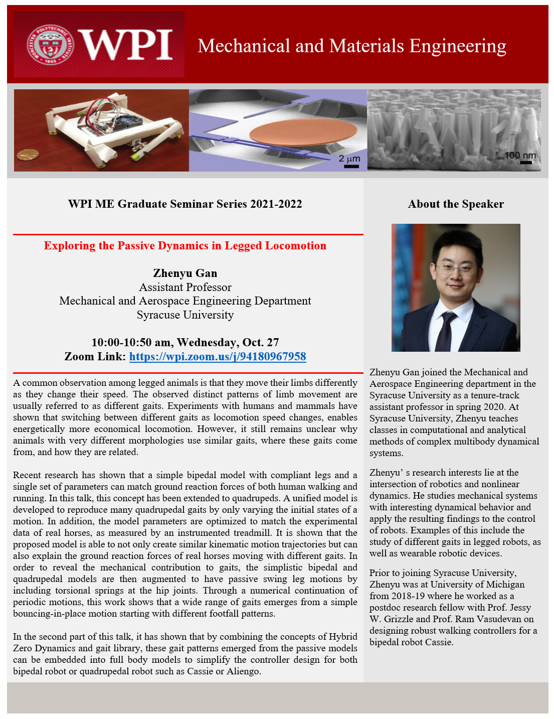 PREVIOUS ANNOUNCEMENT The Beat Newsletter: Faculty News, November 2021 NEXT ANNOUNCEMENT Rachael Heard Promoted to Associate Director of Multicultural Education and First Generation Success ME Graduate Seminar: Zhenyu Ghan, Assistant Professor, ME & AE Dept. Syracuse University Department(s): Mechanical & Materials Engineering October 26, 2021