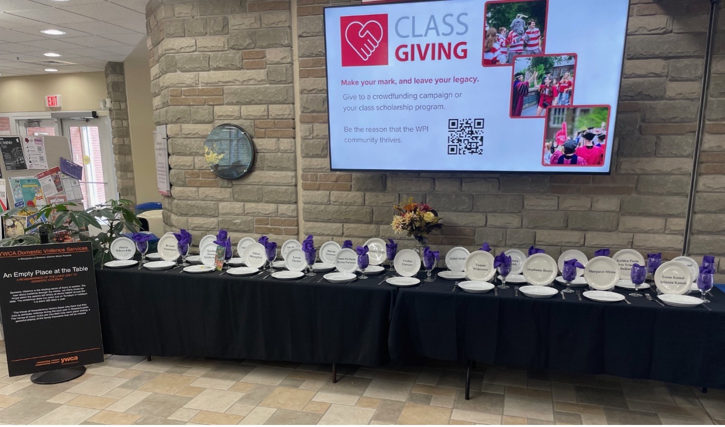 As part of Domestic Violence Awareness Month, WPI Police collaborated with the YWCA to host the An Empty Place at the Table exhibition at the Campus Center from Monday, October 28th, to Friday, November 1st. This tribute of remembrance honors those who have lost their lives to domestic violence in the past year in Massachusetts. The names of every victim are inscribed onto each place setting, creating a powerful display of the family's loved ones.