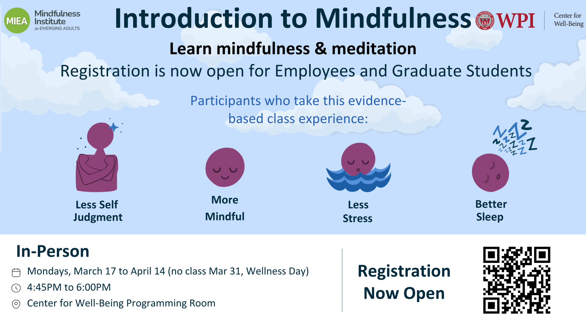 MIEA Intro to Mindfulness is a four-week evidence-based mindfulness curriculum the Center for Well-Being is offering to WPI employees and graduate students at no cost. Registration is now open for the in-person program that runs Mondays, 4:45 to 6:00pm, Mar 17 to Apr 14 (skip Mar 31, wellness day). Register here.