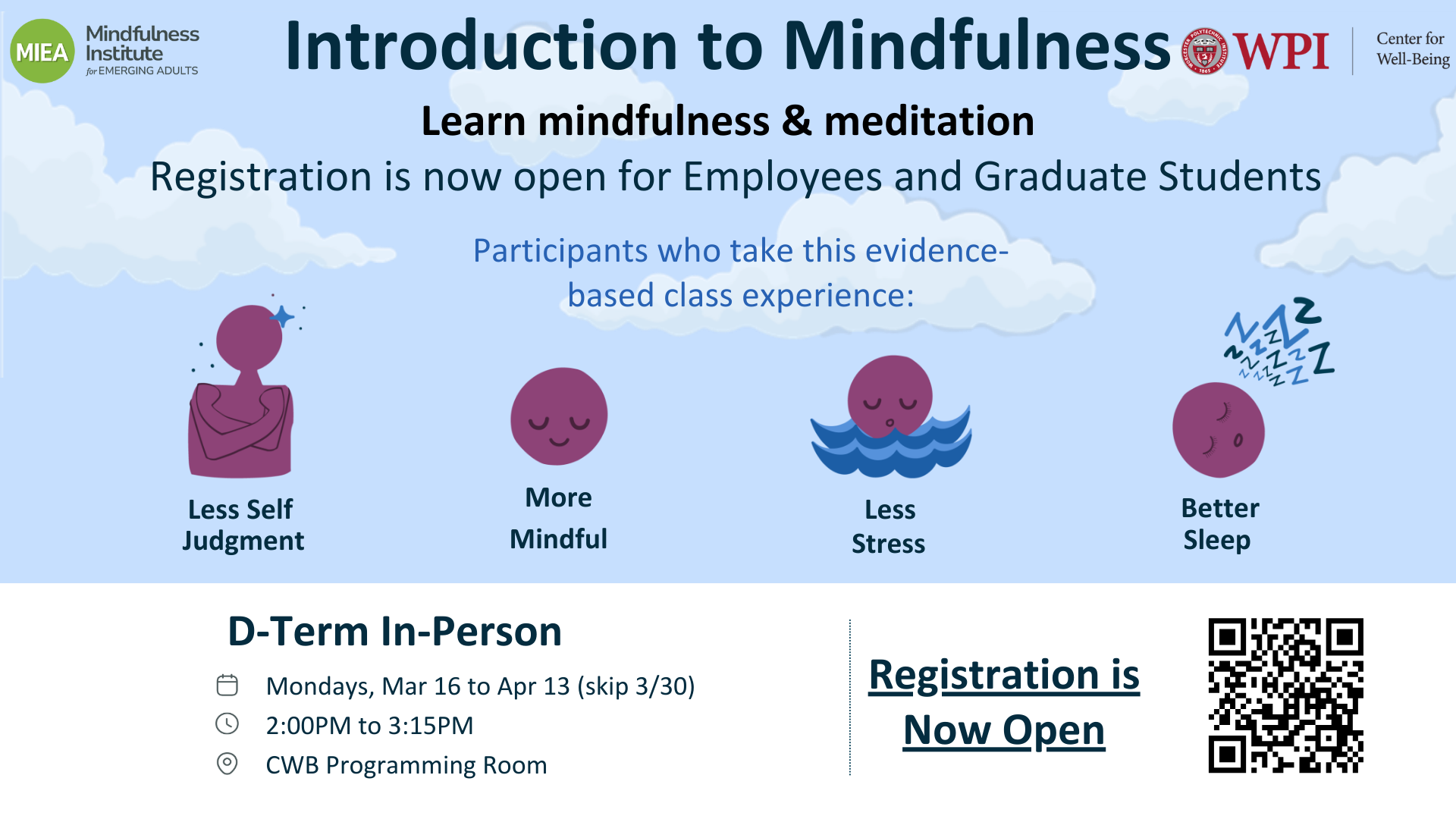 MIEA Intro to Mindfulness is a four-week evidence-based mindfulness curriculum the Center for Well-Being is offering to WPI employees and graduate students at no cost. Registration is now open for the in-person program that runs Mondays, 2:00 to 3:15 PM, Mar 16 to Apr 13. Register here.