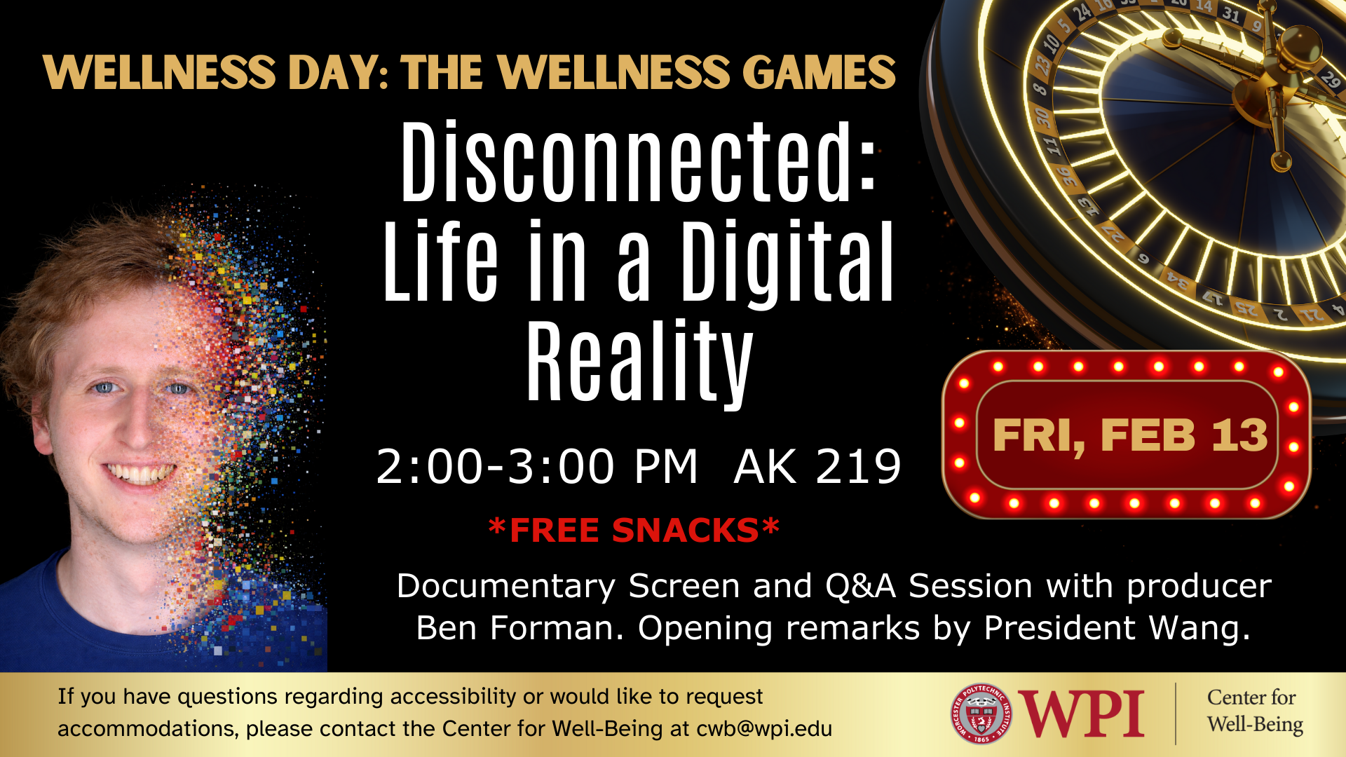 Depression, anxiety, and loneliness are at all-time highs among young people—but what’s the story behind the stats? Join us on Wellness Day, February 13th, from 2-3pm in AK 219 for an exclusive screening of Disconnected: Life in a Digital Reality, a powerful documentary exploring how growing up in a smartphone- and social media-driven world shapes mental health, relationships, and identity. Opening remarks by President Wang. The screening will be followed by a moderated Q&A with producer and college student Ben Forman, who will share insights and practical strategies for reclaiming attention, well-being, and genuine human connection in a digital age. *Free Snacks*