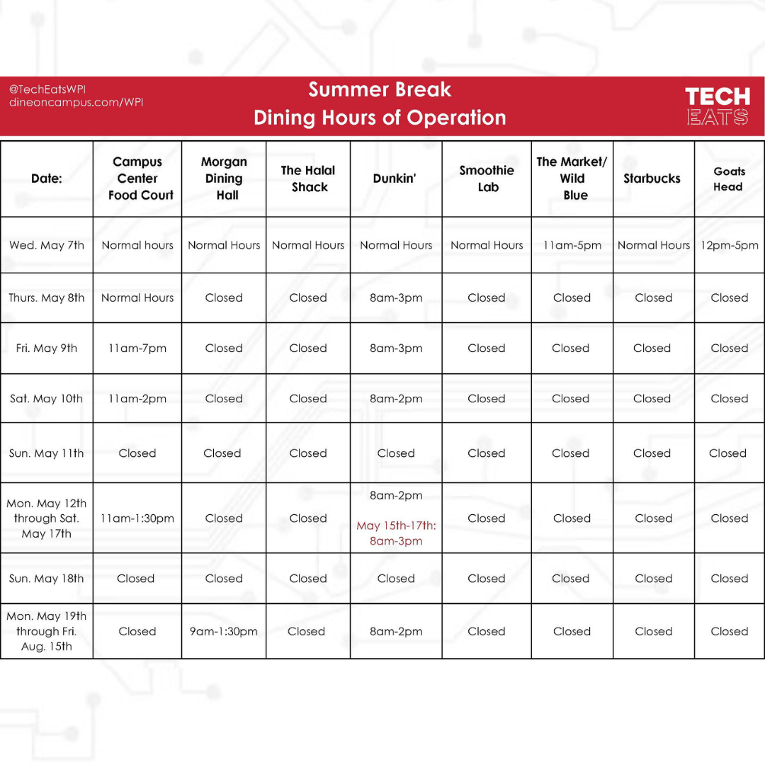 PREVIOUS ANNOUNCEMENT Research @ WPI | April 2025 Newsletter NEXT ANNOUNCEMENT Moving Out? Donate your used items! Summer Dining Hours of Operation Department(s): Dining Services April 25, 2025 School is out for summer, which means our dining hours of operation have adjusted slightly. Please see the attached graphic or visit https://dineoncampus.com/WPI/hours-of-operation to see full hours and stay up to date!