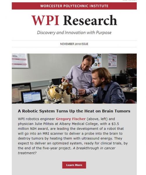 Each month during the academic year, WPI’s research communications team compiles five recent stories about the university’s research enterprise and packages them into an e-newsletter called WPI Research. This regular snapshot of the groundbreaking and innovative work undertaken by our faculty and student researchers goes out to a national audience of academic and government leaders, and others whose interest and support could help further WPI’s goals of increasing research funding and attracting outstanding faculty members and students. Because furthering WPI’s research enterprise is an important element of the university’s strategic plan and the new capital campaign, and since the achievements of our diverse research programs are something in which we can all take pride, WPI Research will, starting this month, be also shared with WPI’s faculty and staff. Watch for the November issue in your inbox soon.