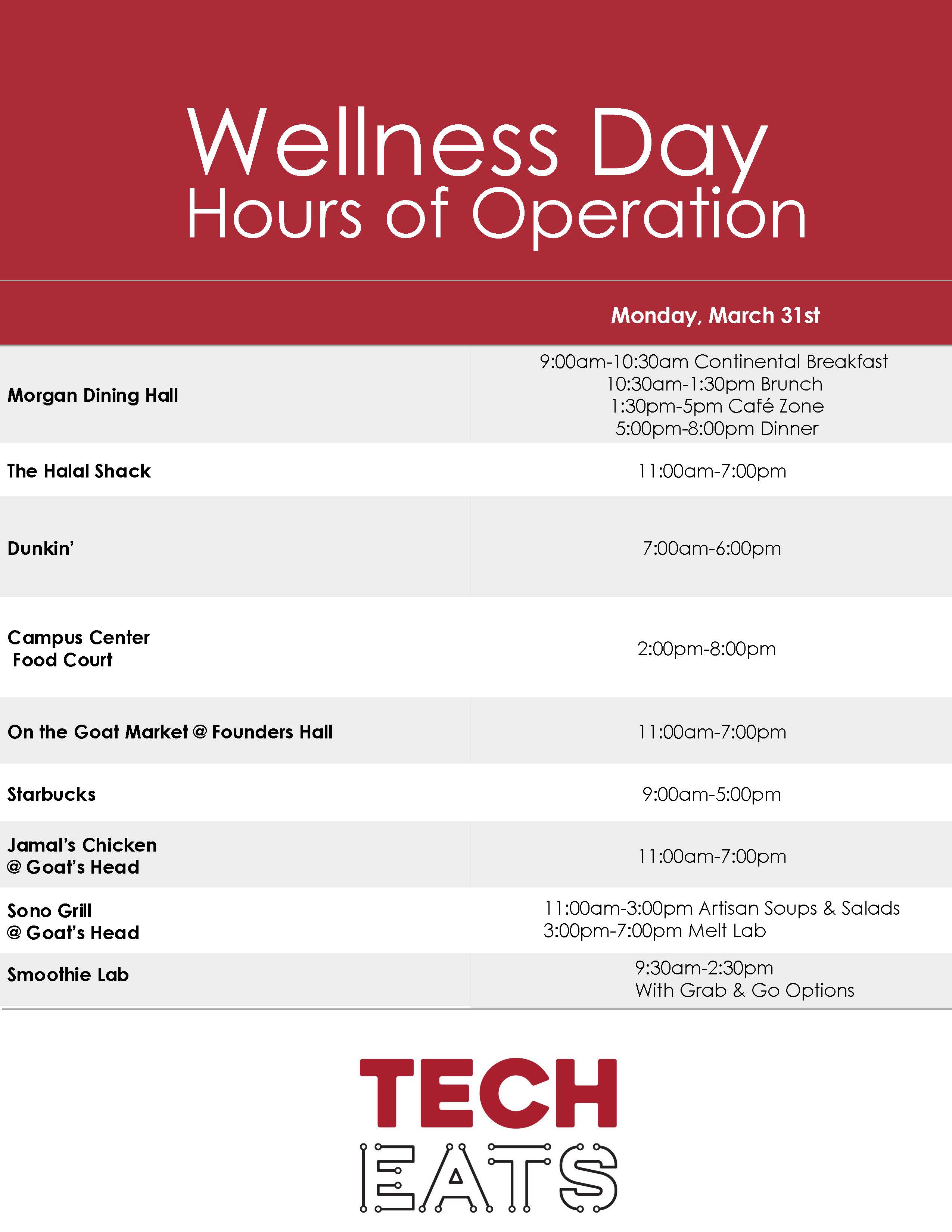 PREVIOUS ANNOUNCEMENT Where in the World Are Students in D-Term ’25? NEXT ANNOUNCEMENT Dean's Discourse Wellness Day Dining Hours of Operation Department(s): Dining Services March 24, 2025 Please note on-campus dining hours of operation for the next Wellness Day, March 31st. For full hours, please visit: https://dineoncampus.com/WPI/hours-of-operation