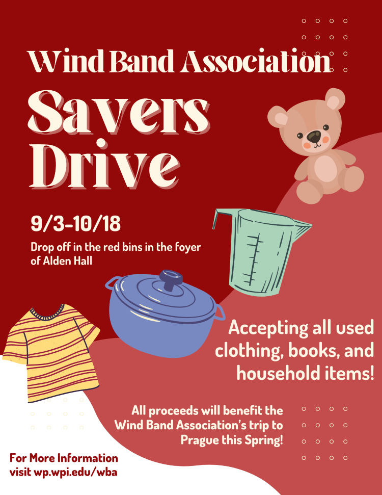PREVIOUS ANNOUNCEMENT Social Engineering - SECURE IT September 2024 NEXT ANNOUNCEMENT Using AI for International Development: A Learning Summit Wind Band Association Savers Drive Department(s): Humanities & Arts September 12, 2024 The Wind Band Association is holding a drive collecting used clothing, books, and household items to support their spring trip to Prague. Red bins are located in the foyer of Alden Hall for donations. Items will be accepted through October 18.