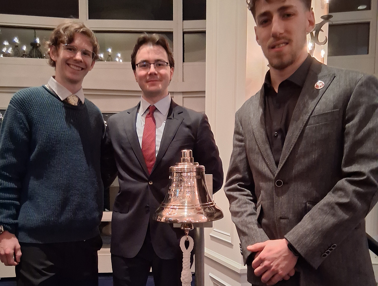 WPI students Charles Pressey ’28, Max Sivert ’26, and Jamie Appell ’26 attended the commissioning ceremony for the USS Massachusetts in March.