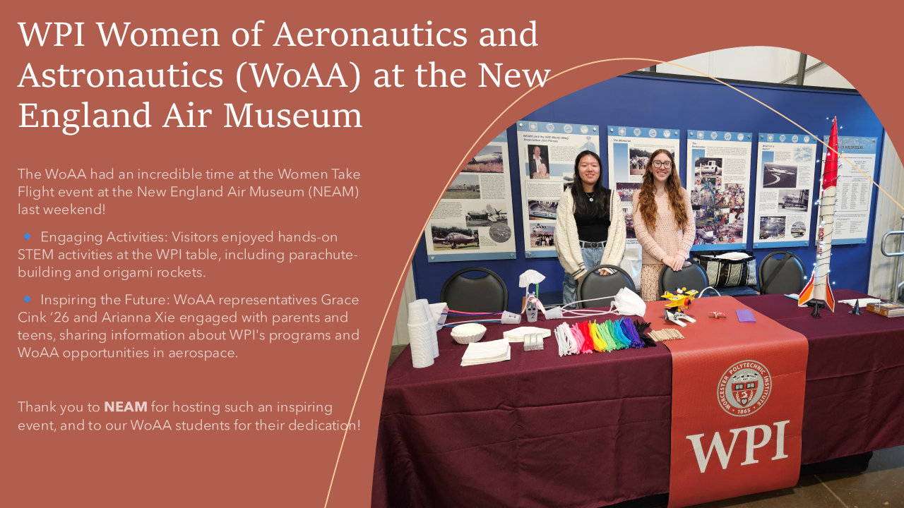 PREVIOUS ANNOUNCEMENT Finance & Operations March Newsletter NEXT ANNOUNCEMENT Performance Management Training Sessions for Individual Contributors & Managers WPI Women of Aeronautics and Astronautics (WoAA) at the New England Air Museum Department(s): Aerospace Engineering March 12, 2025 WoAA representatives Grace Cink ‘26 and Arianna Xie engaged with parents and teens, sharing information about WPI's programs and WoAA opportunities in aerospace. Topics Aerospace