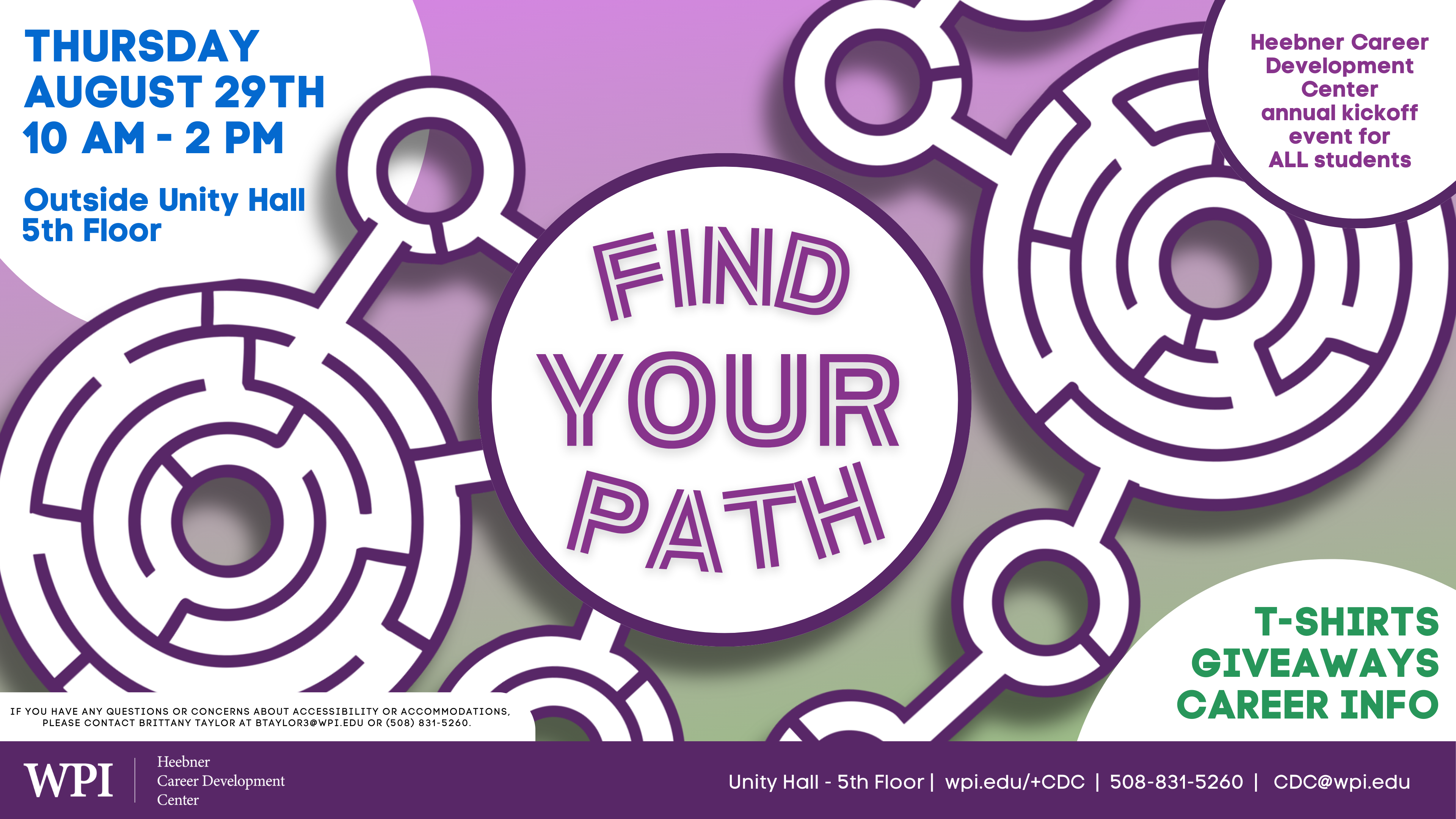 Find Your Path: Heebner Career Development Center Kickoff 2024 Thursday, August 29, 202410:00 a.m. to 2:00 p.m. Location Unity Hall Floor/Room # 5th Floor Entrance Come and join the Heebner Career Development Center (HCDC) at our annual kickoff! Swing by the Unity Hall 5th floor entrance to grab some giveaways, be entered into a raffle, play Jenga, and learn about the CDC and upcoming events! Add to Google Calendar Add to Calendar Audience(s) Current Students | Graduate Students Event Website https://wpi.joinhandshake.com/events/1574816/share_preview Department(s): Career Development Phone Number: 5088315260 Email: cdc@wpi.edu