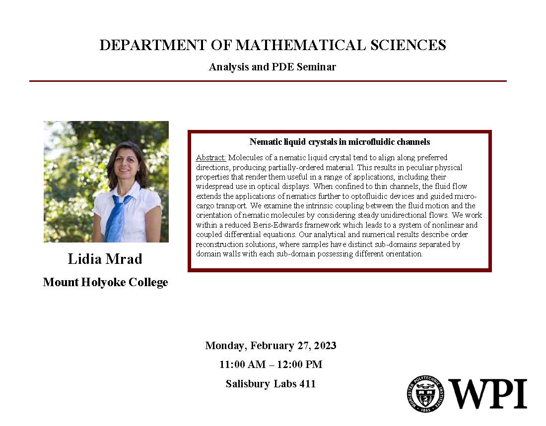 Mathematical Sciences Department, Analysis/PDE Seminar - Lidia Mrad, Mount Holyoke College "Nematic liquid crystals in microfluidic channels" (SL 411)