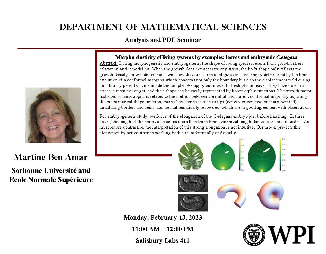 Mathematical Sciences Department, Analysis/PDE Seminar - Martine Ben Amar, Sorbonne Universite and Ecole Normale Superieure "Morpho-elasticity of living systems by examples: leaves and embryonic C.elegans" (SL 411)