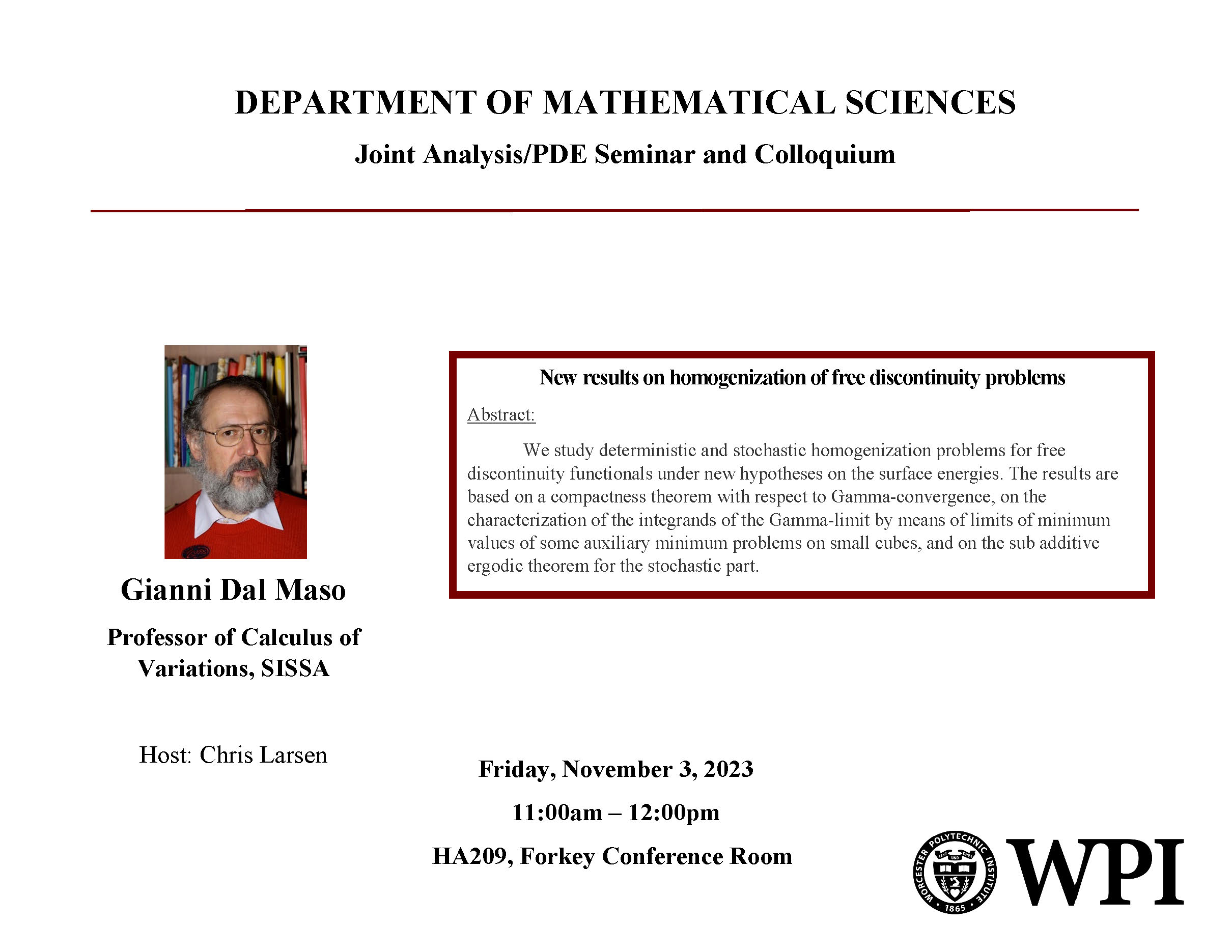 Mathematical Sciences Department, Colloquium & Analysis/PDE Seminar - Gianni Dal Maso, SISSA "New results on homogenisation of free discontinuity problems" (HA, Forkey Conference Room)