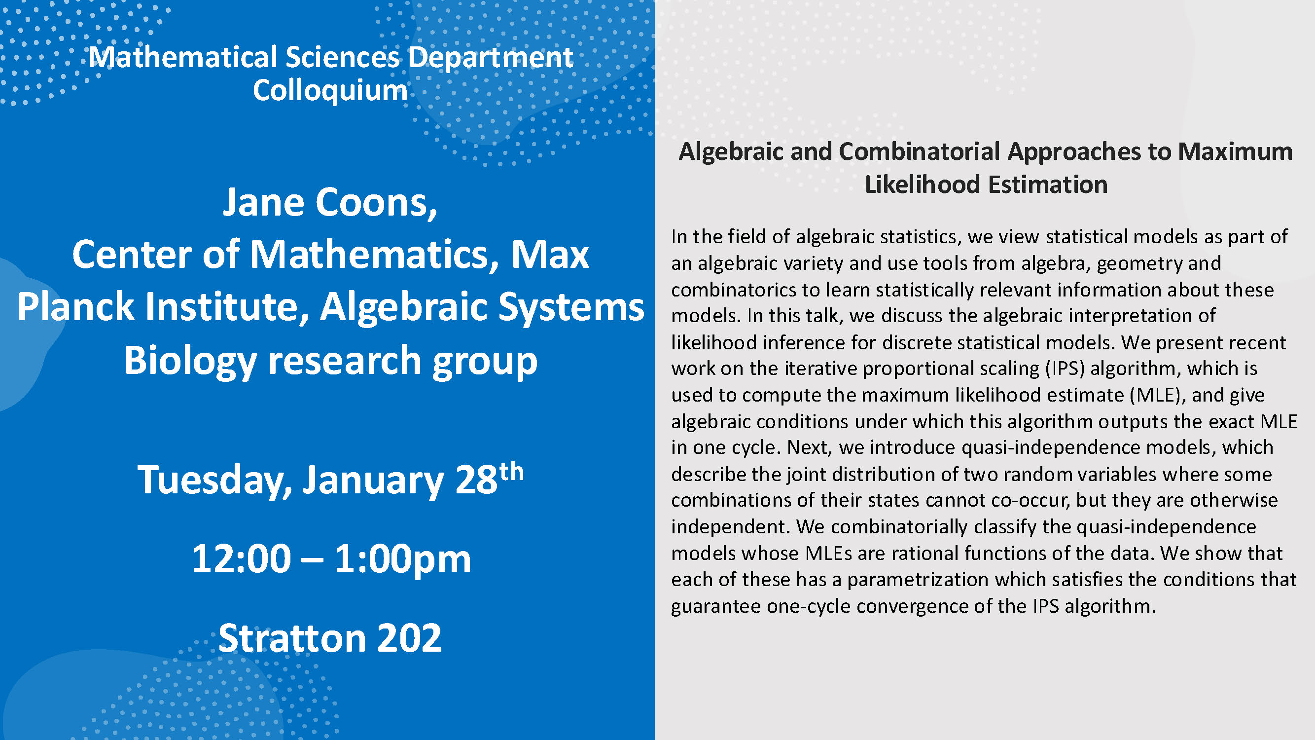 Mathematical Sciences Department Colloquium - Jane Coons, Max Planck Institute