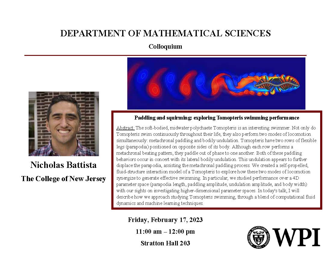 Mathematical Sciences Department, Colloquium - Nicholas Battista, The College of New Jersey "Paddling and squirming: exploring Tomopteris swimming performance" (SH203)