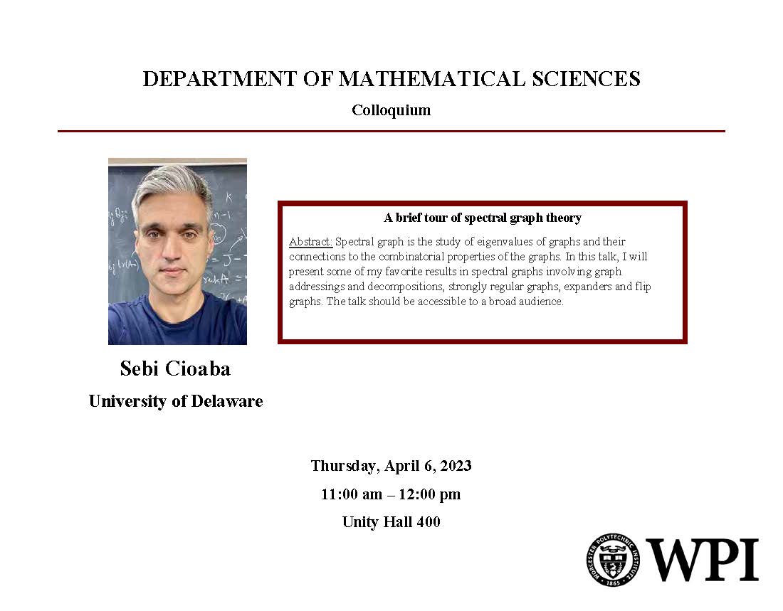 Mathematical Sciences Department Colloquium - Sebi Cioaba, University of Delaware "A brief tour of spectral graph theory" UH 400