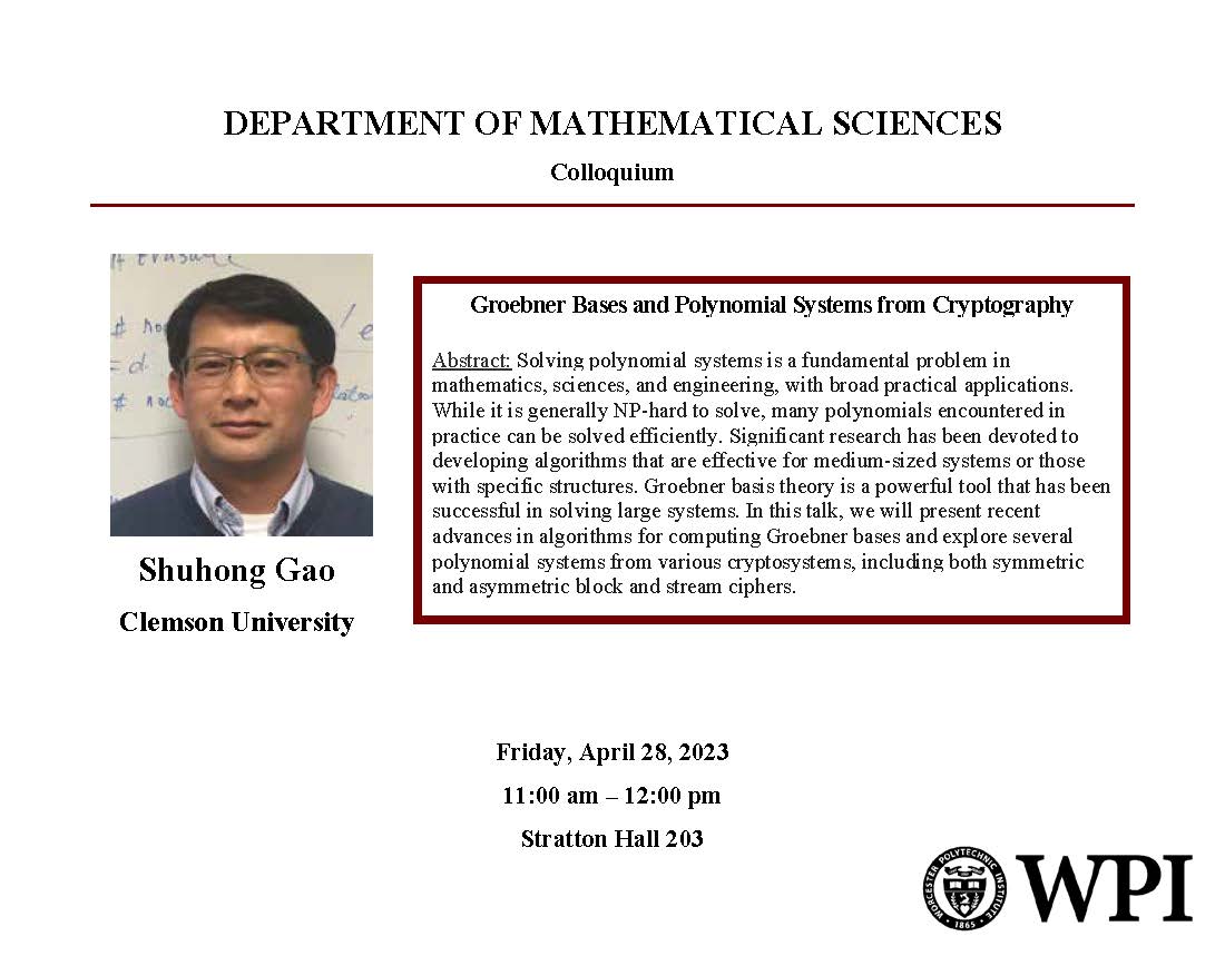 Mathematical Sciences Department, Colloquium - Shuhong Gao, Clemson University "Groebner Bases and Polynomial Systems from Cryptography" (SH203)