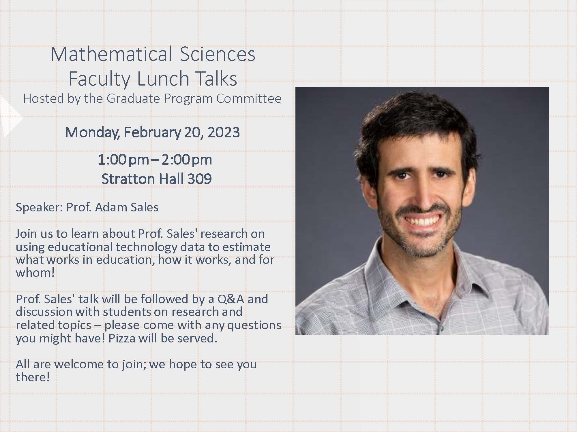 Mathematical Sciences Department, Faculty Lunch Talk - Adam Sales, WPI (SH309) Monday, February 20, 20231:00 p.m. to 2:00 p.m. Location Stratton Hall Floor/Room # 309 Mathematical Sciences Department Faculty Lunch Talk Speaker: Prof. Adam Sales Monday, February 20, 2023 1:00 pm - 2:00 pm Stratton Hall 309 Add to Google Calendar Add to Calendar Audience(s) Current Students | Faculty | Graduate Students Department(s): Mathematical Sciences