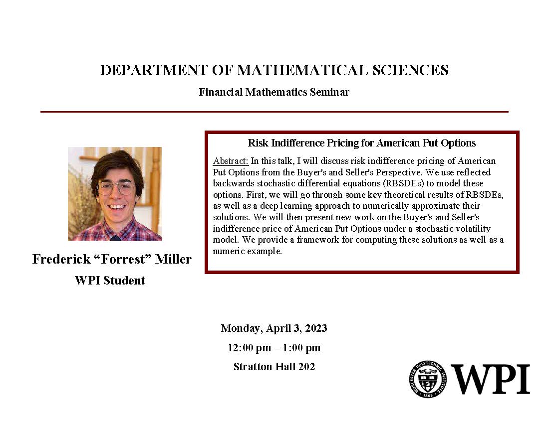 Mathematical Sciences Department, Financial Math Seminar - Frederick Miller, WPI Student "Risk Indifference Pricing for American Put Options" SH 202