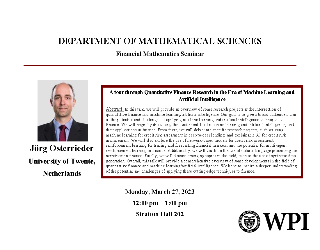 Mathematical Sciences Department, Financial Math Seminar - Jörg Osterrieder, University of Twente "A tour through Quantitative Finance Research in the Era of Machine Learning and Artificial Intelligence" SH 202