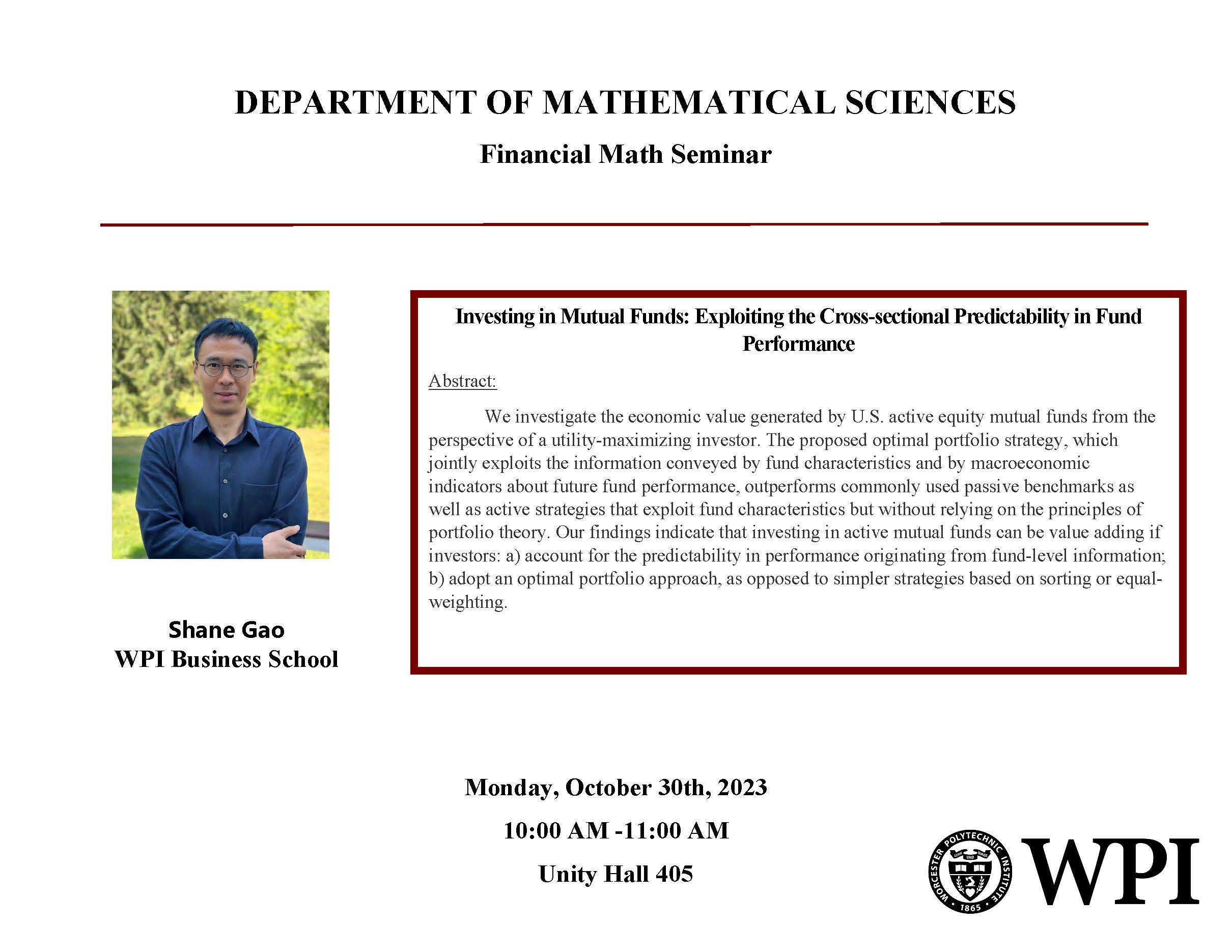 Mathematical Sciences Department Financial Math Seminar - Shane Gao, WPI Business School (UH405)