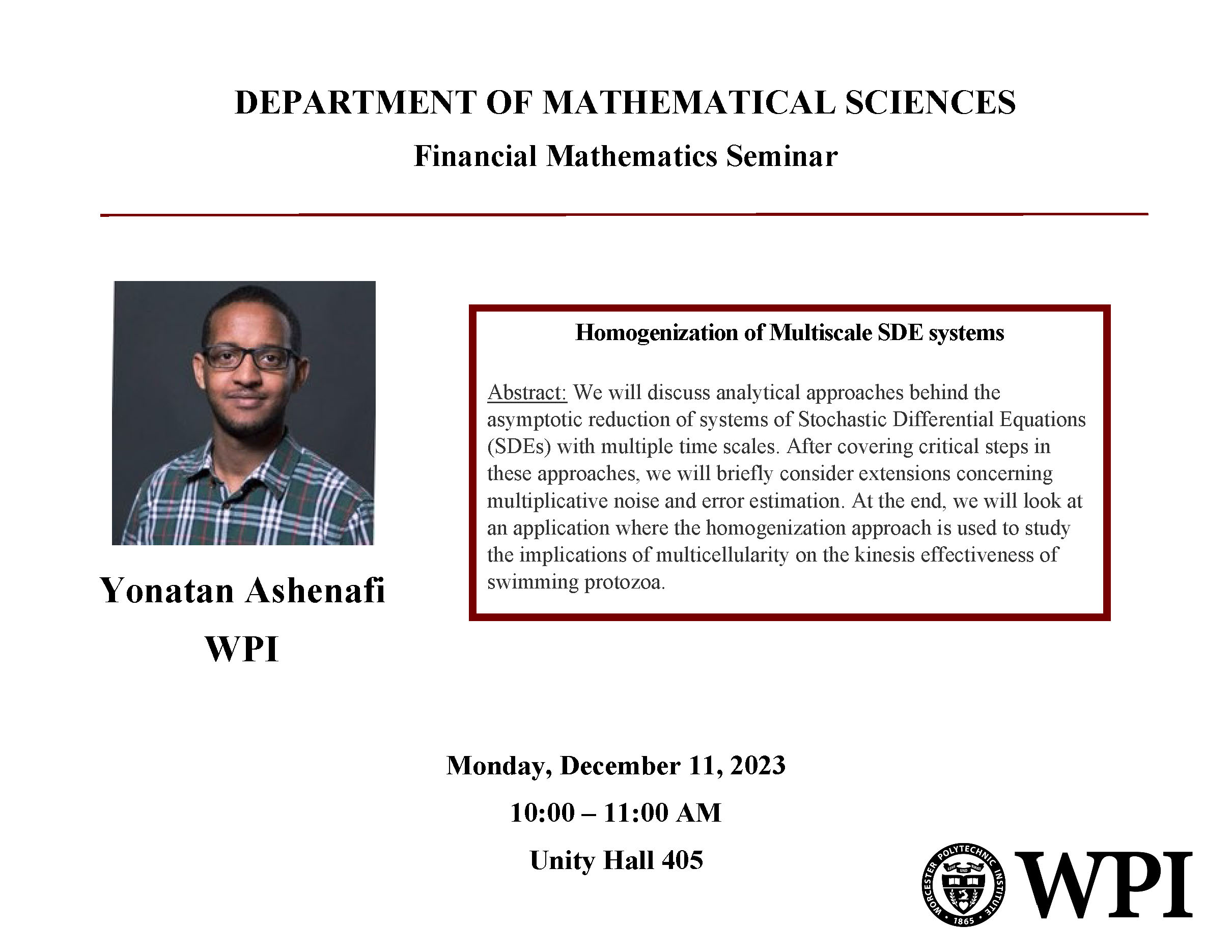 Mathematical Sciences Department Financial Math Seminar - Yonatan Ashenafi, WPI (UH 405)