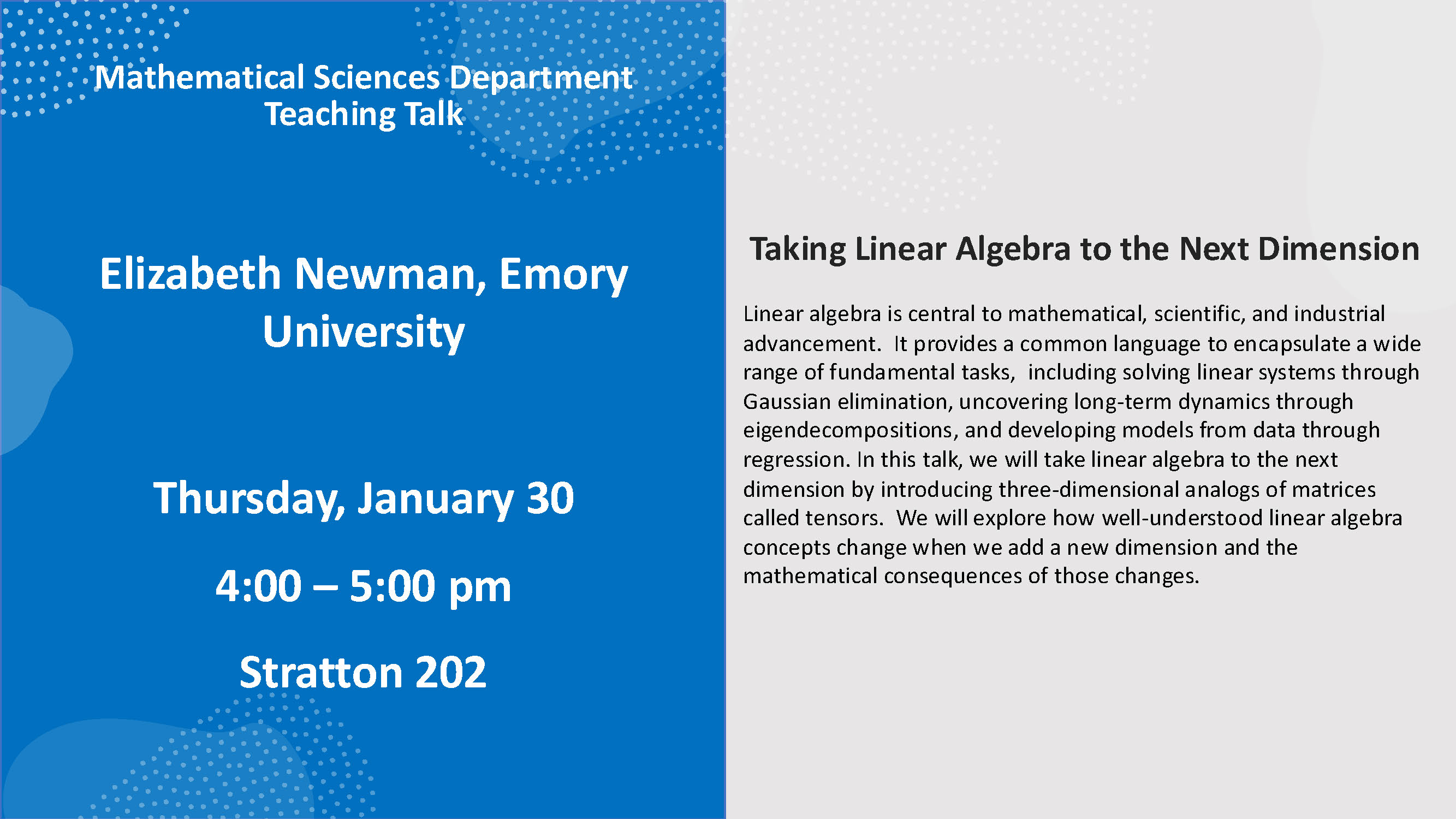Abstract: Linear algebra is central to mathematical, scientific, and industrial advancement. It provides a common language to encapsulate a wide range of fundamental tasks, including solving linear systems through Gaussian elimination, uncovering long-term dynamics through eigendecompositions, and developing models from data through regression. In this talk, we will take linear algebra to the next dimension by introducing three-dimensional analogs of matrices called tensors. We will explore how well-understood linear algebra concepts change when we add a new dimension and the mathematical consequences of those changes.