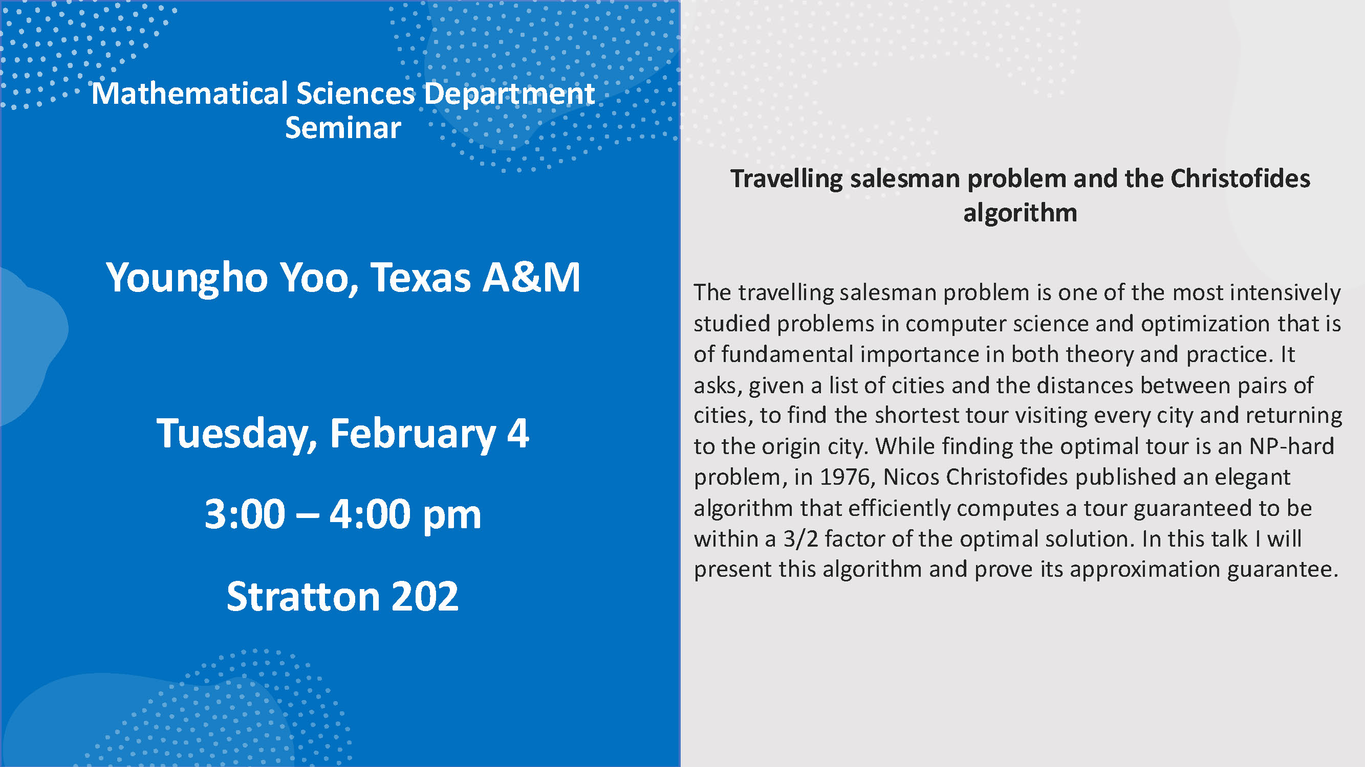Abstract: The travelling salesman problem is one of the most intensively studied problems in computer science and optimization that is of fundamental importance in both theory and practice. It asks, given a list of cities and the distances between pairs of cities, to find the shortest tour visiting every city and returning to the origin city. While finding the optimal tour is an NP-hard problem, in 1976, Nicos Christofides published an elegant algorithm that efficiently computes a tour guaranteed to be within a 3/2 factor of the optimal solution. In this talk I will present this algorithm and prove its approximation guarantee.