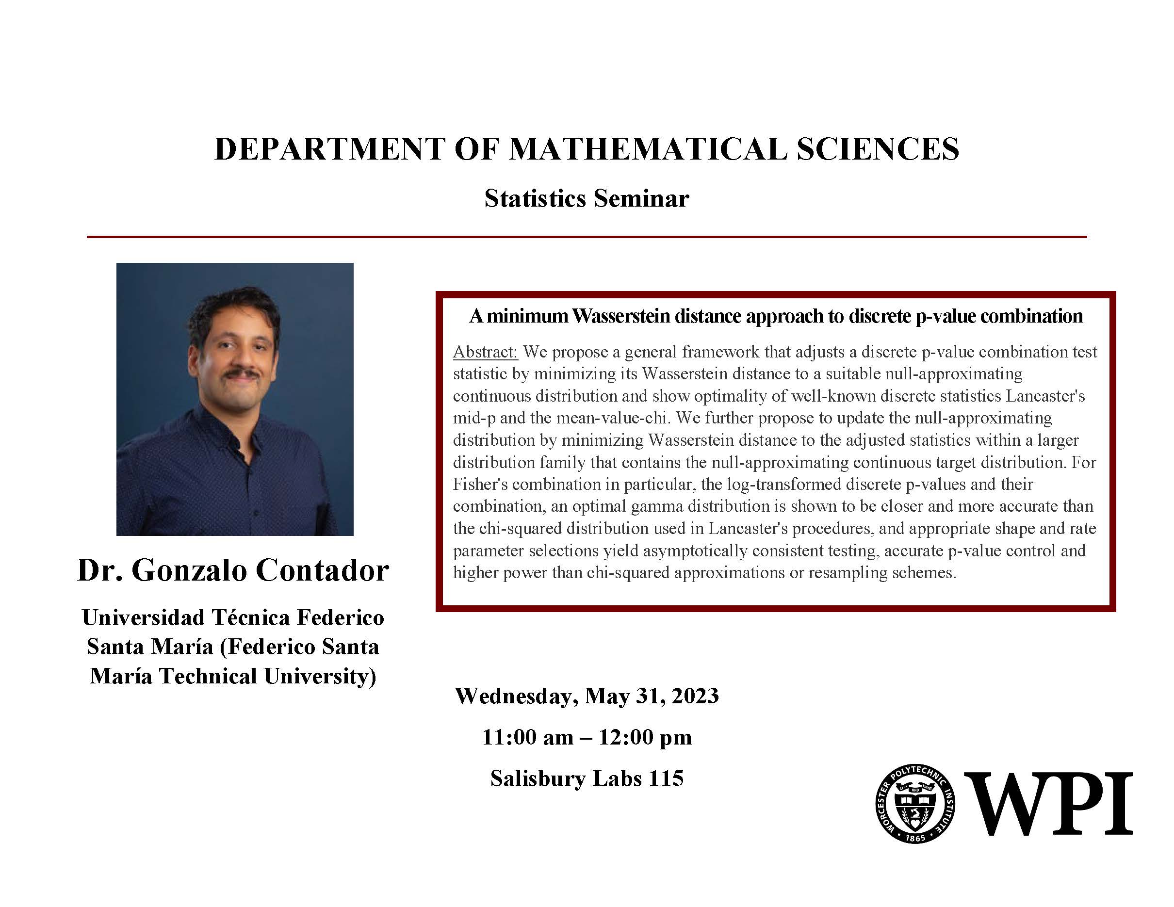 Mathematical Sciences Department, Statistics Seminar Series - Dr. Gonzalo Contador, Federico Santa María Technical University "A minimum Wasserstein distance approach to discrete p-value combination" (SL115)