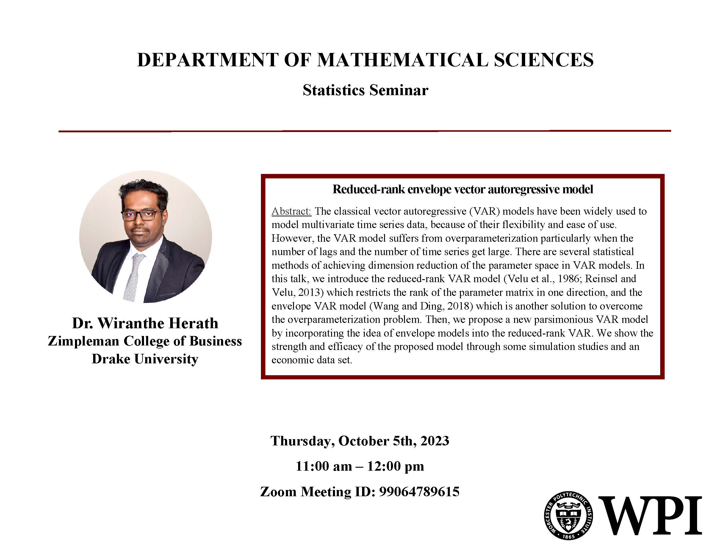 Mathematical Sciences Department Statistics Seminar - Wiranthe Herath, Drake University "Reduced-rank envelope vector autoregressive model" (via Zoom: 99064789615)