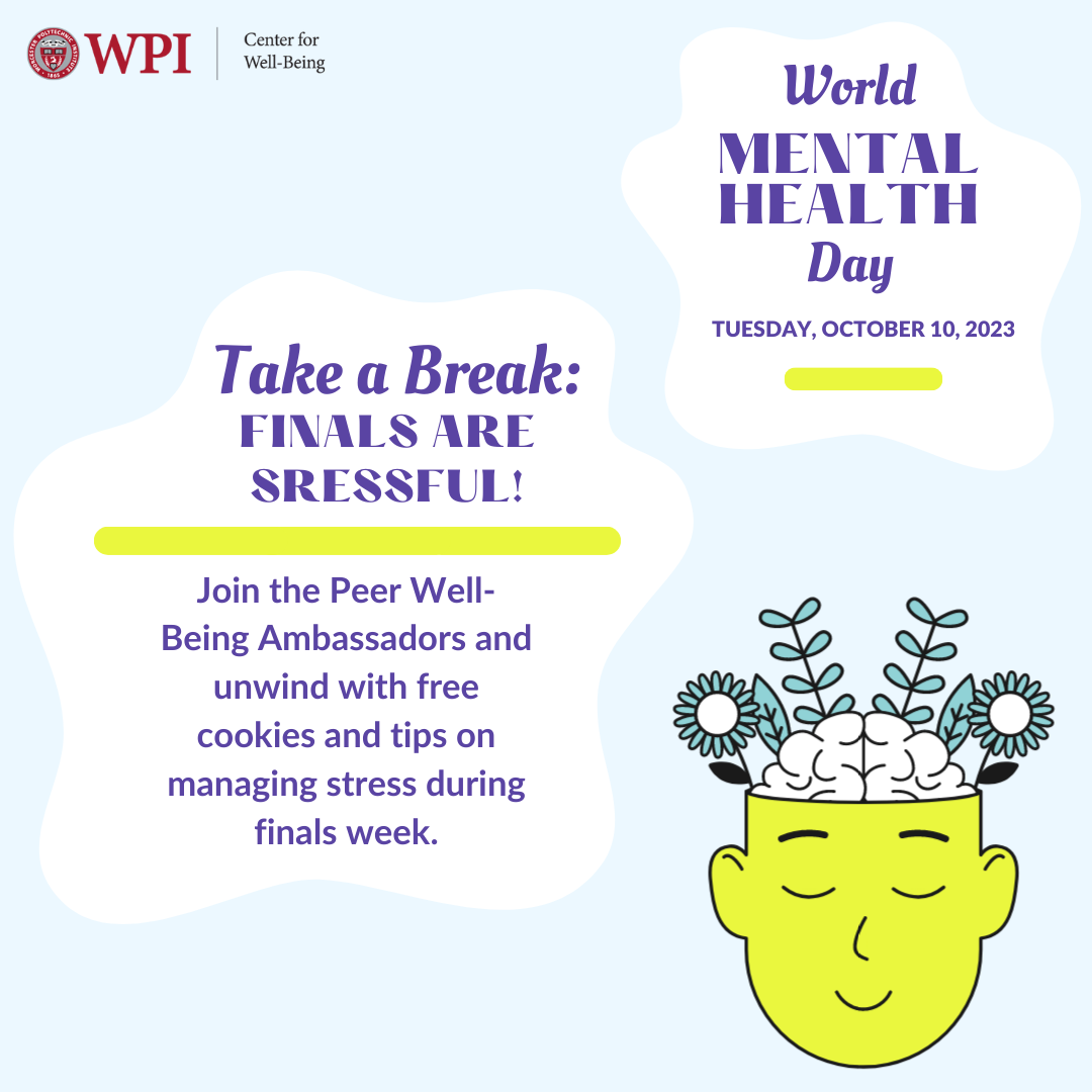 Take a Break: Finals are Stressful Tuesday, October 10, 202312:00 p.m. to 9:00 p.m. Location Morgan Hall Floor/Room # Wedge In recognition of World Mental Health Day, take a break and join the Center for Well-Being's Peer Well-Being Ambassadors and unwind with free cookies and tips on managing stress during final's week. Everything is better with cookies! Add to Google Calendar Add to Calendar Audience(s) Current Students | Faculty | Graduate Students | Staff Department(s): Center for Well-Being