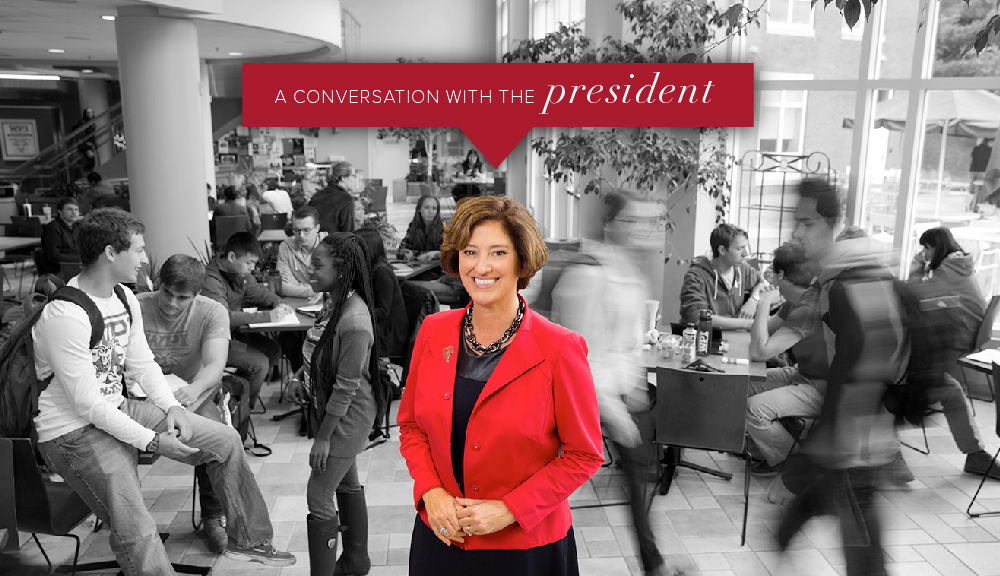 The incoming class of 2017 represents the most gender-balanced class in its history, with female students representing 43% of the freshman student body—an increase of 10%. President Laurie Leshin invited senior vice president Kristin Tichenor to talk about this development, which places WPI among STEM institutions with the highest percentage of female students.