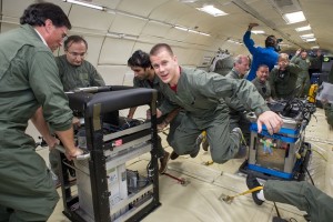 One of the perks of having projects that have been approved and selected for use in the International Space Station is the invitation to ride in NASA’s zero-gravity specialty aircraft nicknamed the “Vomit Comet.” The plane produces 20-second periods of zero gravity by flying in a series of steep parabolas. It can provide varying gravity environments by changing the speed and the angle of the flight, and does this up to 40 times per flight. If needed, the gravity on Mars or the moon can also be simulated.