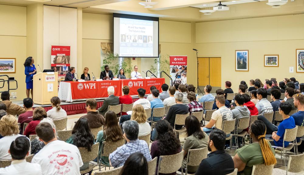 The panelists, who also fielded questions from the packed audience, were Dmitry Korkin, associate professor and director of the bioinformatics and computational biology program; Bengisu Tulu, associate professor, Foisie Business School; Xinming Huang, professor and Dean’s Excellence and Joseph Samuel Satin Fellow, electrical and computer engineering; Matthew Spofford ‘22, computer science; and Soundar Srinivasan, head and director of the AI program at Microsoft New England.