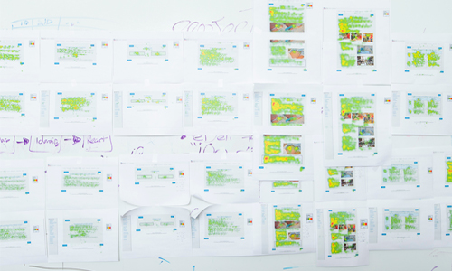 This is our thinking wall. We use it to see the whole picture of our research, and come up with outside-the-box solutions. This example is of an eye tracking project, where we are trying to see the impact of two different designs on how people processed the information that was provided to them.