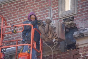 The structural integrity of the 100-year-old carved limestone pieces was in question, so it was not known if they would get damaged or destroyed during the removal process, according to Fred DiMauro, assistant vice president of facilities. In addition, the original building construction drawings were not detailed enough to show the system used for anchoring the grotesques to the building, presenting a possible additional challenge.